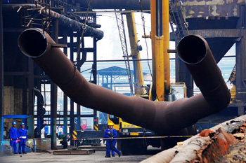 施工人员对河北霸州市新利钢铁公司的450立方米高炉进行拆除。
