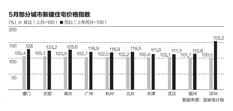 国家统计局发布的5月份70个大中城市的住宅销售价格统计数据显示,5月份厦门房价环比涨幅高达5.5%,全国第一。合肥环比涨幅高达5.1%,同比涨幅高达23.3%,外加南京、苏州,这四城是房价上涨最为迅猛的二线“四小龙”。