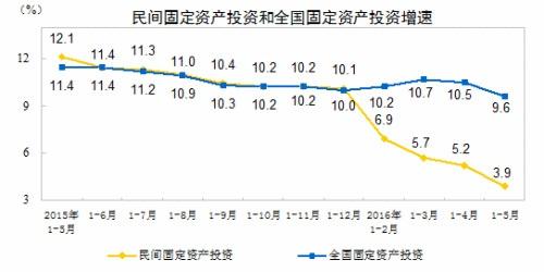 今年以来,民间投资增速持续回落,引发舆论和官方的高度关注。国家统计局数据显示,1-5月份,民间固定资产投资同比名义增长3.9%,增速比1-4月份回落1.3个百分点。
