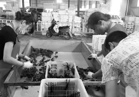 7月13日,潜江小龙虾交易中心工作人员正按个头大小分拣小龙虾。