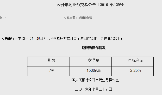 据中国人民银行最新消息,人民银行于本周一(7月25日)以利率招标方式开展了1500亿逆回购操作。