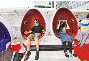 位于龙华新区广电文化创意园的文博会时尚影视分会场。图为观众在体验虚拟现实机器。(资料图片)
