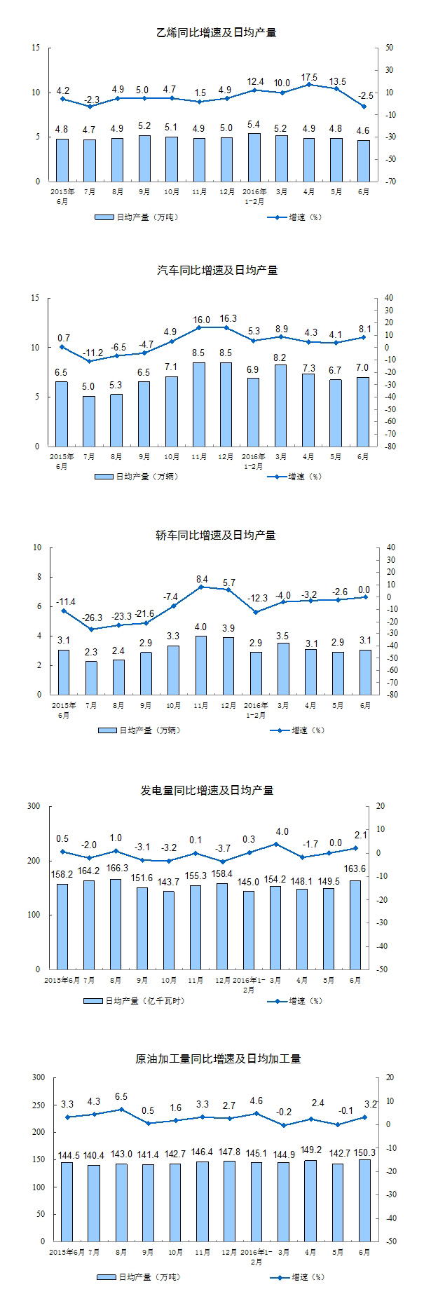 分产品看,6月份,589种产品中有347种产品同比增长。其中,钢材10072万吨,同比增长3.2%;水泥22278万吨,增长2.6%;十种有色金属443万吨,下降1.2%;乙烯139万吨,下降2.5%;汽车211.3万辆,增长8.1%;轿车92.1万辆,与去年同期持平;发电量4908亿千瓦时,增长2.1%;原油加工量4508万吨,增长3.2%。