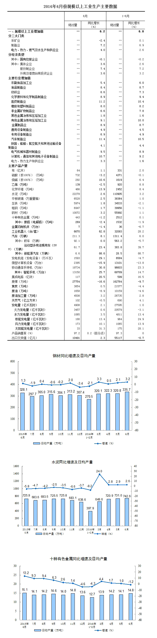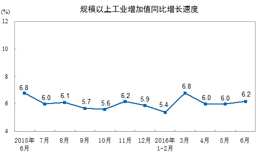 2016年6月份,规模以上工业增加值同比实际增长6.2%(以下增加值增速均为扣除价格因素的实际增长率),比5月份加快0.2个百分点。从环比看,6月份,规模以上工业增加值比上月增长0.47%。1-6月份,规模以上工业增加值同比增长6.0%。