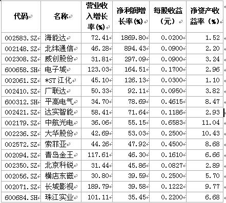 从增长幅度看,21家公司上半年营业收入增长超过了30%,9家公司超过了50%, *ST橡塑 、 长城影视 、 电子城 、 青岛金王 、 珠江实业 的营业收入增长最快,相比2015年同期均实现了翻倍增长。净利润增长方面,41家公司增长超过了30%,27家公司增速超过了50%, 多氟多 、 海能达 、 汉王科技 、 北纬通信 等15家公司利润增速则实现了翻倍增长。同时,数据也显示,海能达、北纬通信、 威创股份 等16家公司,今年上半年无论营业收入还是净利润都有望实现30%以上的增速。