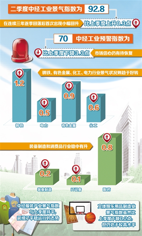 原材料及能源行业出现“分化”。煤炭行业形势依然严峻,钢铁、有色金属、化工、电力行业景气状况则趋于好转。二季度中经钢铁产业景气指数为95.8,比上季度上升1.2点,中经钢铁产业预警指数由“浅蓝灯”区进入到“绿灯”区运行。二季度中经电力产业景气指数、中经有色金属产业景气指数、中经化工产业景气指数中经电力产业预警指数分别比一季度提高0.5点、0.9点和0.6点。