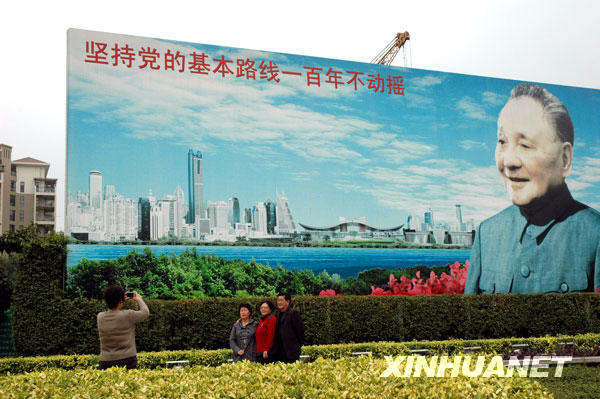 资料图片:2008年12月13日,人们在深圳福田中心区的邓小平画像前留影。新华社记者 彭勇摄
