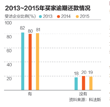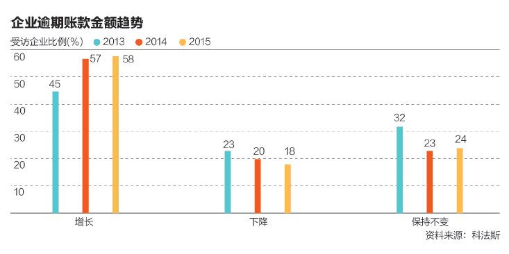 根据国际信用保险及信用管理服务机构科法斯集团的《2016中国企业信用风险报告》,在过去1年中,超过80%的受访企业曾遭遇逾期付款,其中58.1%的受访企业表示在过去一年中逾期金额有所抬升。17.9%的受访者表示,超过3个月的逾期金额额度已经超过了它们年营收的5%。该报告显示,中国的总体付款形势仍颇为严峻。