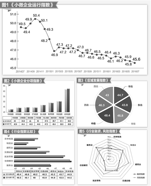 2016年7月份,“经济日报-中国邮政储蓄银行小微企业运行指数”(见图1)为45.6,较上月下降0.2个点,降幅较上月扩大0.1个点,表明本月小微企业总体运行受阻,经济增长微观活力不足。