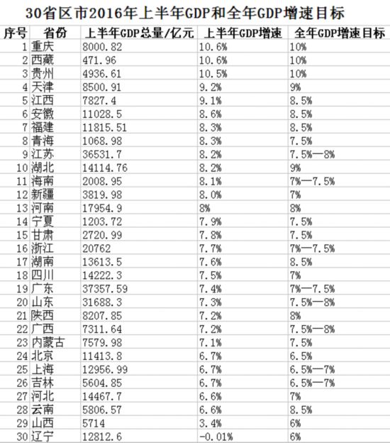 截至目前,全国31个省(区、市)中,除黑龙江外,均已公布2016年上半年GDP数据。记者统计30省份上半年的GDP增速发现,和今年年初各地制定的2016年GDP增速目标相比,今年上半年,重庆、西藏等15省份GDP增速超过全年目标,广东、上海、吉林、河南4地的增速与全年目标一致或处于全年目标区间范围内。其余11省份上半年经济增速低于全年预期目标,其中山西、辽宁两地上半年经济表现与全年目标差距较大,GDP实际增速与全年预期值相差超过2个百分点。