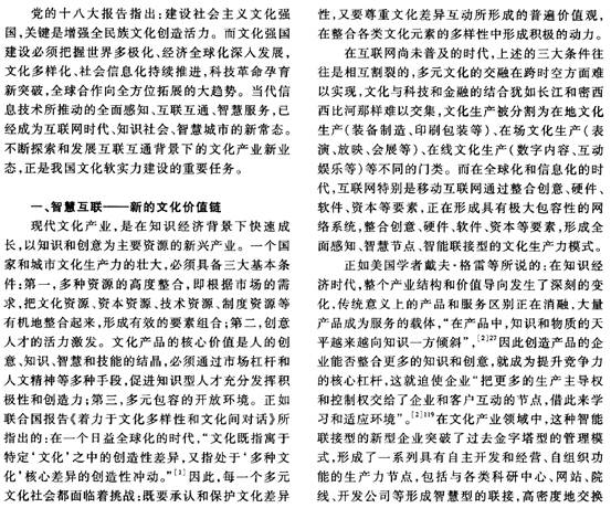 建设社会主义文化强国,关键是增强全民族的文化创造力。全面感知、互联互通、智慧服务,正在成为互联网时代和智慧城市的新常态。探索互联互通背景下的文化产业新业态,是中国提升文化软实力的重要内容。它包括:发展智慧互联的文化企业,打造文化生产的价值链;发展新型的服务平台链,集聚商业流、信息流和资金流等;发展文化科技研发链,以迭代更新增强产业核心竞争力;发展跨业融合的联动产业链,为相关产业等提供更多的增长动力。