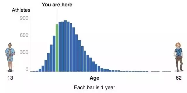 不仅如此,他们还将运动员的成绩与每个金牌和世界纪录保持者做对比,做出数据可视化作品,通过宏观的比赛成绩数据,让人们更直接了解该运动员的综合水平