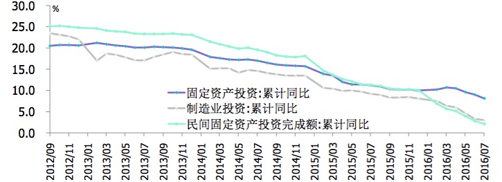 盛松成称,随着货币供应量增加,大量货币流向企业,但企业活期资金增加并非因为经营扩张,而是企业持币观望、谨慎投资。实体经济制造业投资和民间固定资产投资增速持续低迷。2016年1-7月制造业投资同比增长3.0%,较上月下降0.3个百分点,创2004年以来的历史最低值;1-7月民间固定资产投资同比仅增2.1%,比上年同期低9.2个百分点,较上月下降0.7个百分点,为2012年一季度首次发布以来的历史最低值。