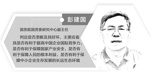 彭建国:当今世界经济处于全球化新时代,在市场边界不断扩大的条件下,判定是否垄断及其好坏,必须有全球化视野、国家经济社会发展全局高度和前瞻性战略思维。主要应看其是否有利于提高中国企业国际竞争力,是否有利于保障国家产业安全,是否有利于保障人民的根本利益,是否有利于保障中小企业生存发展的长远生态环境。过去,我们把特大型企业拆分,形成有限的市场竞争,在相对封闭的国内市场是正确的。在国内、国际两个市场一体化的今天,通过联合重组形成具有国际竞争力的企业航母,以应对国外超大型跨国公司的竞争,同样是不得不采取的战略选择。当然,在这个过程中,也要运用好市场经济规则,用《反垄断法》等法律手段,防止局部垄断产生的负面效应。