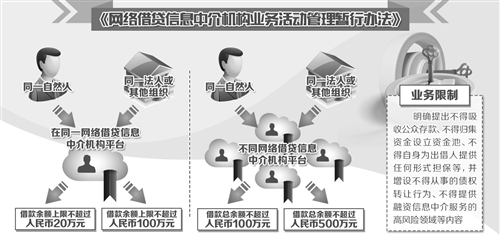 同时,《办法》规定,同一自然人在同一网络借贷信息中介机构平台的借款余额上限不超过人民币20万元;同一法人或其他组织在同一网络借贷信息中介机构平台的借款余额上限不超过人民币100万元;同一自然人在不同网络借贷信息中介机构平台借款总余额不超过人民币100万元;同一法人或其他组织在不同网络借贷信息中介机构平台借款总余额不超过人民币500万元。