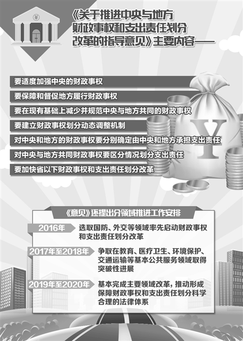 据悉,《意见》还提出了分领域推进的工作安排:2016年选取国防、外交等领域率先启动财政事权和支出责任划分改革。2017年至2018年争取在教育、医疗卫生、环境保护、交通运输等基本公共服务领域取得突破性进展。2019年至2020年基本完成主要领域改革,推动形成保障财政事权和支出责任划分科学合理的法律体系。
