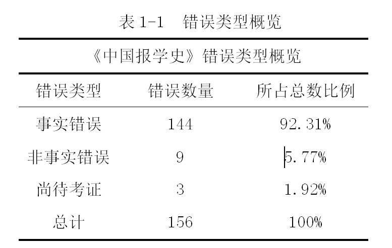 《史实订误》纠正了《中国报学史》的156处错误,通过仔细观察后,笔者发现,其中有3处错误没有得到确定的解释,因此暂时归类于尚待考证的错误;而剩下的153处错误均有合理的解释,其中包含事实错误和非事实错误两大类。具体数据见表1-1:
