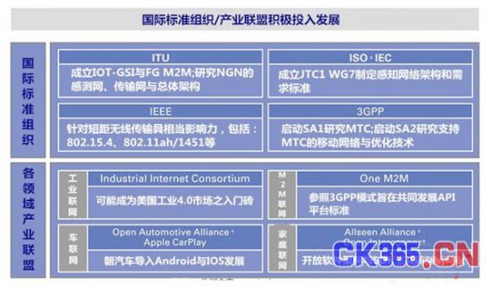 应对物联网飞快发展,国际标准化组织不断进行新的技术标准研究,如国际标准化组织 ITU-T 成立 IoT-GSI 与 FG M2M, 针对国际网络通讯标准协议在物联网的特殊应用进行优化;ISO(International OrgaNIzation for Standardization)/ IEC(International Electrotechnical Commission) 则 成 立 JTC1 WG7,专注于制定感知网络架构和需求标准;IEEE、3GPP(3rd Generation Partnership Project)亦启动相关研究。此外,国际大厂亦成立产业联盟,以掌握物联网技术规范与应用界面规范,如 Intel 主导的 Open Interconnect Consortium(OIC)旨在定义一互操作性框架,以让应用程序、操作系统、通讯协议和设备等各层间互连互通。OneM2M 则在处理不同物联网垂直应用在异制网络互通、设备互通管理、数据交换及信息安全等议题,目标在定义出不同垂直应用之接口标准规范及数据标准格式,以促使跨设备与跨应用之开放与互联互通。由于物联网应用领域十分多元,各领域均有出自于特殊应用需求的专业技术界面规范,中国产业若能积极参与国际产业联盟,以掌握各垂直应用之统一数据格式与接口规范,将有助于厂商掌握不同应用场域需求与系统需求,并能借此切入物联网各领域创新垂直应用。