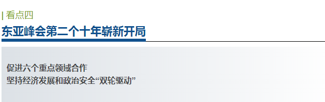东亚峰会是“领导人引领的战略论坛”,汇聚东盟和中、美、俄、印等大国,总人口和经济总量占世界50%以上,是连接东亚合作和亚太合作的重要平台。今年是东亚峰会第二个十年的开局之年。李克强总理将在会上介绍中方对东亚峰会未来发展方向的看法,强调坚持峰会战略论坛定位,坚持东盟主导、协商一致、照顾各方舒适度等原则,推动各方继续落实《〈金边发展宣言〉行动计划》,促进六个重点领域合作,坚持经济发展和政治安全“双轮驱动”,促进峰会健康稳定发展。