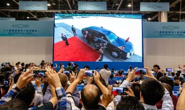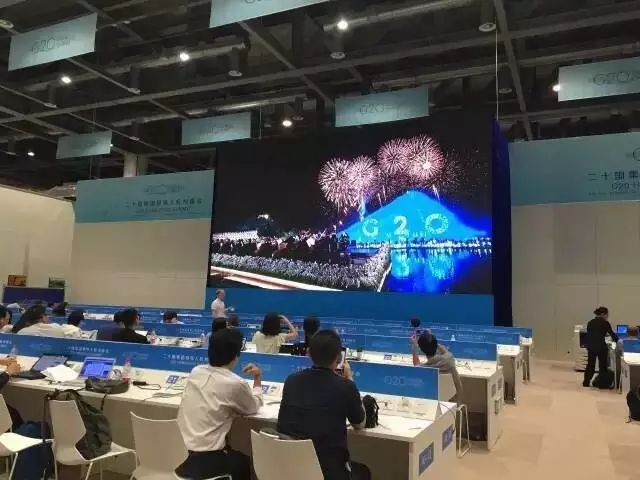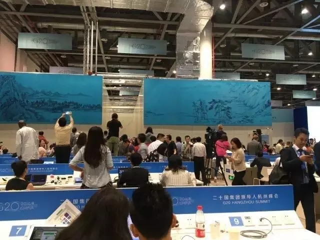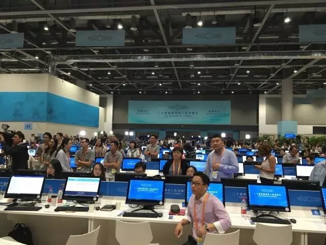 G20会议即将开幕,多数未能获得进入G20现场的媒体,都选择把摄像机对准了大屏幕,从这里获取公共信号进行直播。当现场大屏幕上出现各国代表团车队时,几乎所有记者都放下手上的事,戴上耳机,把目光投向大屏幕。摄影记者的闪光灯频频亮起,“咔嚓咔嚓”的快门声不绝于耳。大屏幕前宽敞的通道,此刻显得非常拥挤。习近平主席致开幕辞时,全球的记者都在聆听“中国声音”。