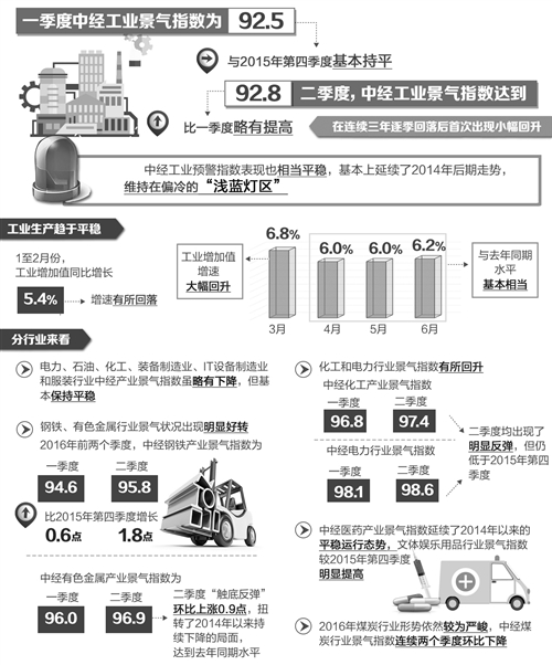 由经济日报社中国经济趋势研究院和中国社科院数量经济与技术经济研究所共同编制的《中经产业景气指数报告(2016上半年)》今日发布。中经产业景气指数报告分为工业、装备制造、煤炭、石油、电力、钢铁、有色金属、IT设备制造、化工、医药、服装、文体娱乐用品制造共十二个部分,重点分析了上述行业和领域2016年上半年运行情况、运行特点和下半年发展趋势。