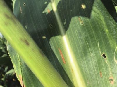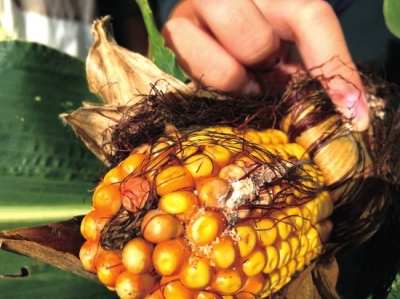 在田地里,转基因玉米与非转基因玉米分方块区分布。记者发现,非转基因玉米留有很多被害虫蚕食的痕迹,叶片上有螟虫吃过的空眼;果实上有很多虫类附着在上面,有些玉米还长出了白色或黑色的霉菌,严重的连茎秆都快折断了。而另一个区域的转基因玉米长势良好,绿色叶片完好,果实圆润饱满,很少看到害虫。