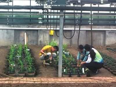阳光玻璃房内盆栽区,技术人员在护理不同发育期的转基因玉米幼苗和植株。京华时报记者潘珊菊摄