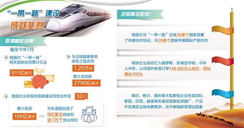 “一带一路”倡议推出3年来,我国已经和“一带一路”沿线30多个国家签署共建合作协议,与20多个国家开展了国际产能合作,一批有影响力的标志性项目逐步落地,“一带一路”建设进度和成果超出预期。商务部统计数据显示,我国对“一带一路”相关国家的投资累计已达511亿美元,占同期对外直接投资总额的12%;与沿线国家新签承包工程合同1.25万份,累计合同额2790亿美元。
