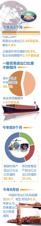 多位接受《经济日报》采访的专家表示,8月进出口数据的双双好转并超出预期,表明当前内外部需求均有所改善,外贸进出口整体处于一个回升的通道。