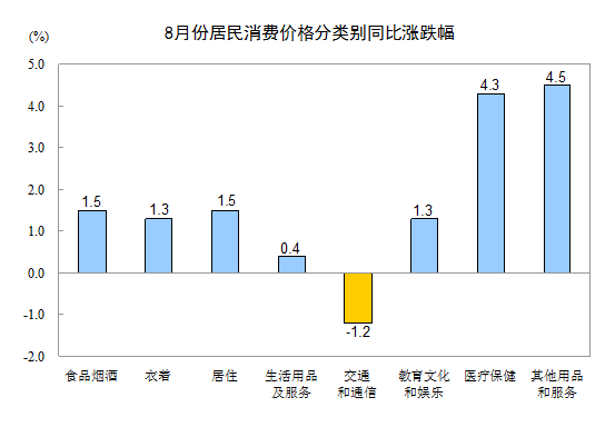 8月份,其他七大类价格同比六涨一降。其中,其他用品和服务、医疗保健、居住、衣着、教育文化和娱乐、生活用品及服务价格分别上涨4.5%、4.3%、1.5%、1.3%、1.3%、0.4%;交通和通信价格下降1.2%。
