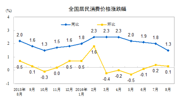 北京9月9日讯 据国家统计局网站消息,2016年8月份,全国居民消费价格总水平同比上涨1.3%。其中,城市上涨1.4%,农村上涨1.0%;食品价格上涨1.3%,非食品价格上涨1.4%;消费品价格上涨0.9%,服务价格上涨2.1%。