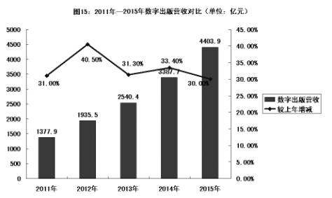 如图14所示,在新闻出版行业各产业类别中,数字出版是增长最快的产业类别。“十一五”期末(2010年),数字出版营业收入为1051.8亿元,到“十二五”期末(2015年)这一数字翻了两番,高达4403.9亿元,5年增长了318.7%。