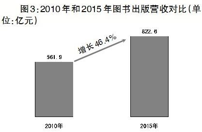 图3中,从图书出版营业收入来看,“十二五”期间,图书出版营业收入大幅增长且年年增长,从“十一五”期末(2010年)的561.9亿元,增长到“十二五”期末(2015年)的822.6亿元,5年增加了261亿元,增长了46.4%。