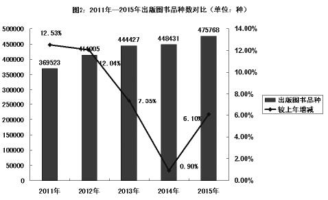 图2中,从品种数增速逐年看,2011年和2012年,出版图书品种数增速均超过12%;2013年,增速回落4.7个百分点;2014年增速继续回落,同比仅微增不到1个百分点;2015年,增速又上升到6.10%。