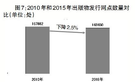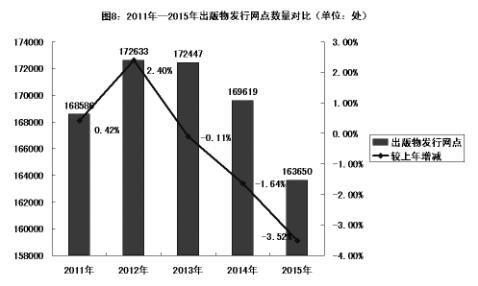 图7中,“十二五”期间,全国出版物发行网点数量变动不大。“十一五”期末(2010年)为16.8万处,“十二五”期末(2015年)为16.4万处,略减少了2.5%。
