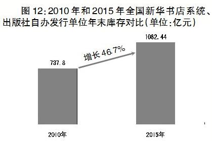如图12所示,“十二五”期间,图书出版营收和出版物发行营收分别增长46.4%、59.8%,与之同步的是,全国新华书店系统、出版社自办发行单位年末库存也增长了46.7%。