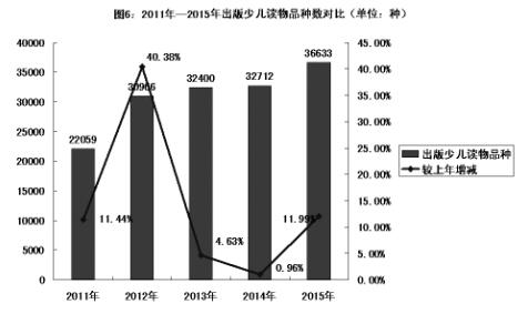 图6中,从全国出版少儿读物品种数增速来看,2012年增速高达40.38%,达到高峰;而2014年则为低谷,仅微增0.96%;2011年和2015年首尾两个年份,都有超11%的增速。