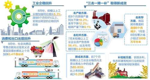 8月份国民经济发展呈现积极变化,工业生产有所加快,投资增速止跌趋稳,市场销售稳中有快,“三去一降一补”取得实效。下一阶段仍须坚持稳中求进工作总基调,用政策落实稳预期,用改革深化增活力,用创新驱动强动能,促进经济持续健康发展—