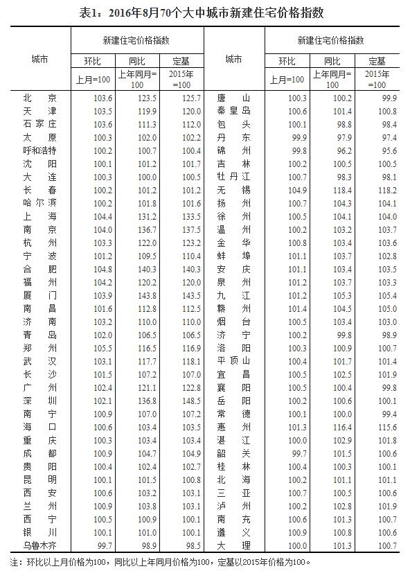 (二)与上年同月相比,70个大中城市中,价格下降的城市有16个,上涨的城市有53个,持平的城市有1个。8月份,同比价格变动中,最高涨幅为46.9%,最低为下降4.4%