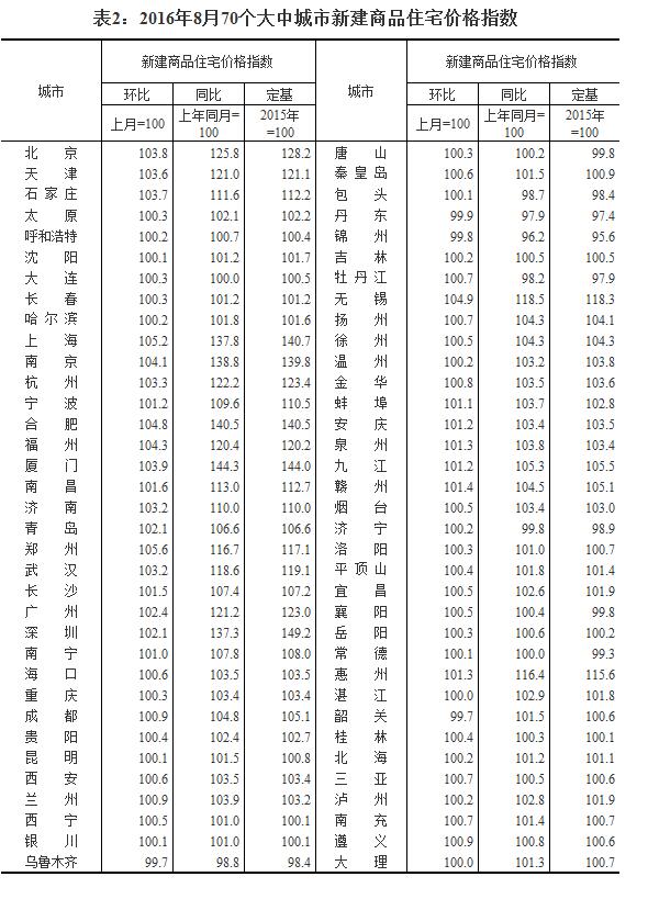 (二)与上年同月相比,70个大中城市中,价格下降的城市有6个,上涨的城市有62个,持平的城市有2个。8月份,同比价格变动中,最高涨幅为44.3%,最低为下降3.8%。