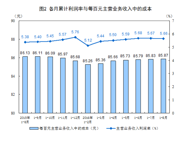 三是单位成本继续下降。8月份,工业企业每百元主营业务收入中的成本为86.14元,同比减少0.2元,继续保持下降态势。