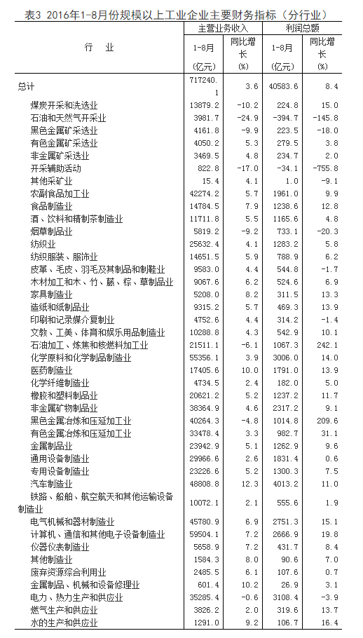 1-8月份,在41个工业大类行业中,33个行业利润总额同比增加,8个减少。主要行业利润情况如下:煤炭开采和洗选业利润总额同比增长15%,农副食品加工业增长9.9%,纺织业增长5.8%,石油加工、炼焦和核燃料加工业增长2.4倍,化学原料和化学制品制造业增长14%,非金属矿物制品业增长9.1%,黑色金属冶炼和压延加工业增长2.1倍,有色金属冶炼和压延加工业增长31.1%,通用设备制造业增长0.6%,专用设备制造业增长7.5%,汽车制造业增长11%,电气机械和器材制造业增长15.1%,计算机、通信和其他电子设备制造业增长19.8%,电力、热力生产和供应业下降3.9%,石油和天然气开采业由同期盈利转为亏损。