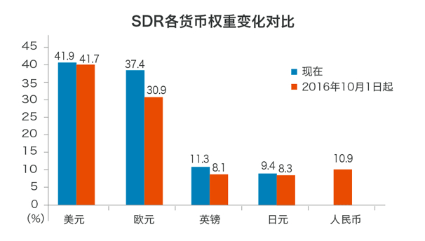 10月1日起,新的SDR货币篮子正式生效,人民币将成为第三大权重货币。这也是SDR首次“新增”成员。届时,五大货币在SDR篮子中的占比分别为——美元(41.73%)、欧元(30.93%)、人民币(10.92%)、日元(8.33%)、英镑(8.09%)。人民币将成为“可自由使用货币”,并在IMF有关交易中扮演核心角色。此外,中国国债三个月基准利率将成为SDR利率篮子中的人民币计值工具。