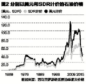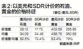 首先,从计价工具的角度看,资产组合的风险分散原理使得篮子货币计价的稳定性更优于单一货币。如果将石油和黄金换算成以SDR计价,价格变动的幅度明显变小(图2、图3)。SDR计价的石油和黄金的价格标准差明显低于由美元计价的水平,由SDR计价的标准差与均值之比也显著低于以美元计价的水平(表2)。此外,SDR对美元的比值波动明显小于其他主权货币。