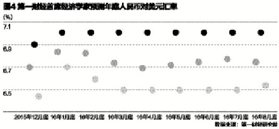 第一财经首席经济学家的调研显示,截至8月底经济学家们预测的年底人民币对美元汇率均值为6.75,较7月的预测值6.78有所升值,预测区间为7.00~6.55,未来人民币贬值空间有限(图4)。