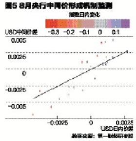 央行的“维稳”迹象值得关注。我们的研究显示,3月以来央行设定人民币对美元中间价时会考虑平抑一揽子货币汇率日内波动,进入8月以来我们观测到这种现象仍在持续。如图5显示,横坐标为美元收盘价/当日中间价,纵坐标为次日中间价/当日中间价;黑色斜线为将收盘价作为次日中间价的情况。如果次日中间价背离黑线时,则中间价的设定参考了其他因素,此时我们发现,如果模拟的CFETS人民币指数当日下跌后,央行会大概率将美元中间价调高;而当指数上涨时,美元中间价大概率会比前日收盘价低。