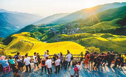 游客在广西龙胜各族自治县龙脊梯田景区游览拍照。