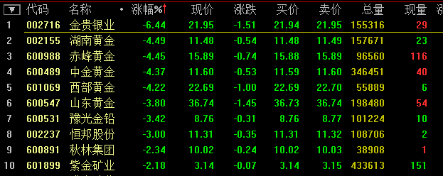 今日早盘,黄金概念股集体下挫,截至发稿,金贵银业跌6.44%,盘中一度跌逾8%,湖南黄金、赤峰黄金、中金黄金、西部黄金跌逾4%,山东黄金等个股跌幅居前。