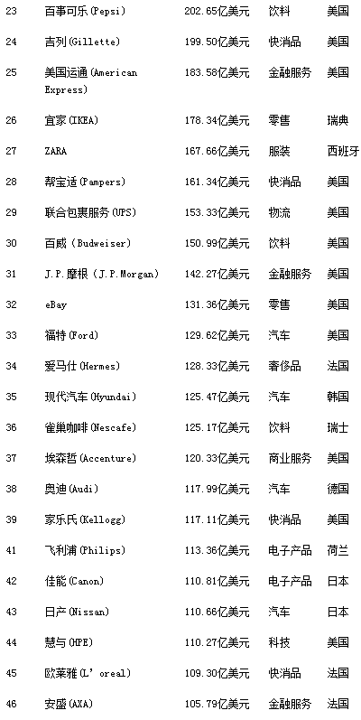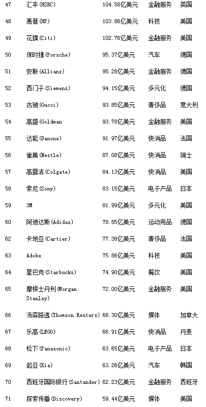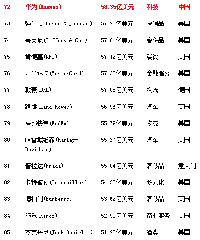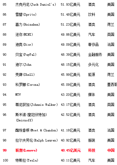 上榜的100个品牌中有52个来自美国,10个来自德国,8个来自法国,6个来自日本。中国也有两个品牌上榜,它们是华为和联想,分别位列第72位和第99位。