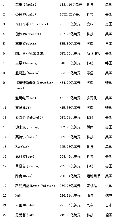 报告称,苹果公司的品牌价值较前一年提高5%,达1,780亿美元,谷歌较前一年提高11%,达1,330亿美元。全球百大品牌总价值接近1.8万亿美元。